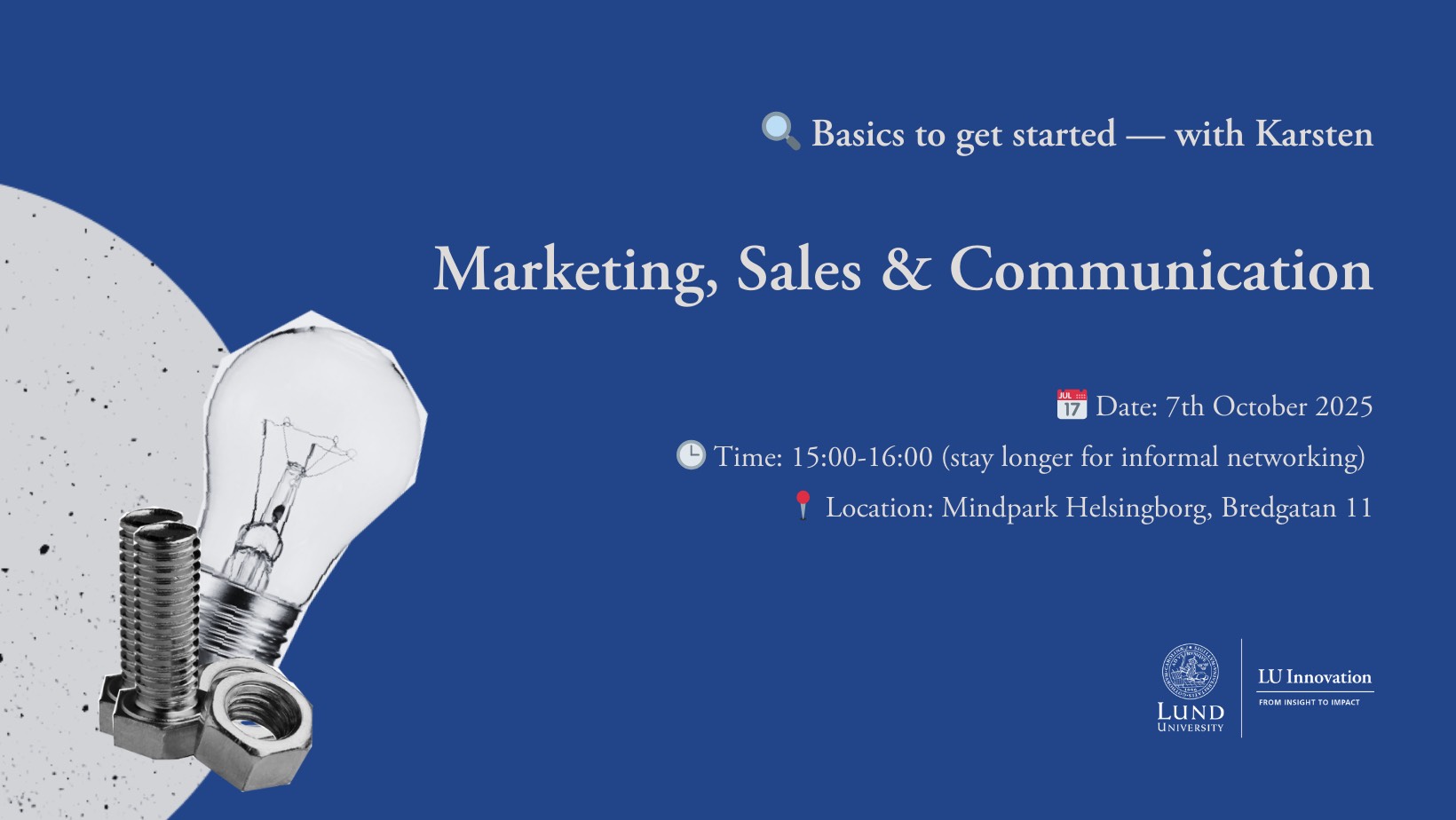 Organizer: LU Innovation Open for: primarily for students at Lund University Fee: free Sign-up: here Basics to Get You Started: Marketing, Sales & Communication – with Karsten Are you curious about marketing, sales, […]